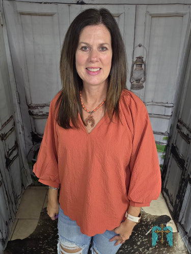Split V-Neck Top With Balloon Sleeve-Chocolate Brown