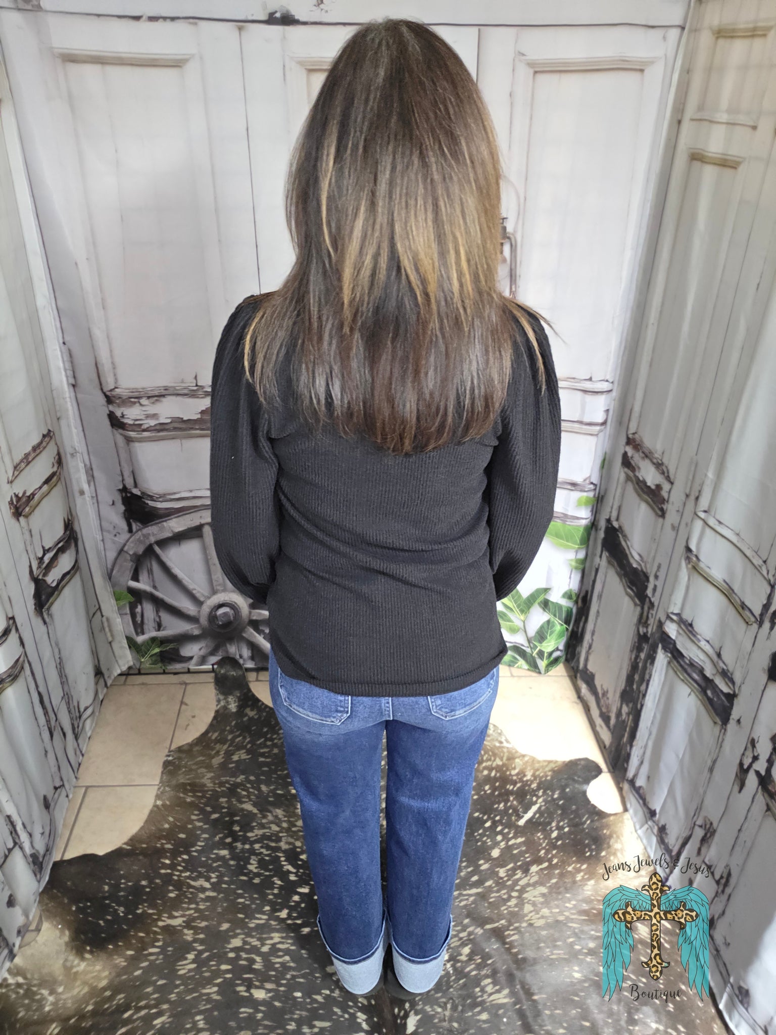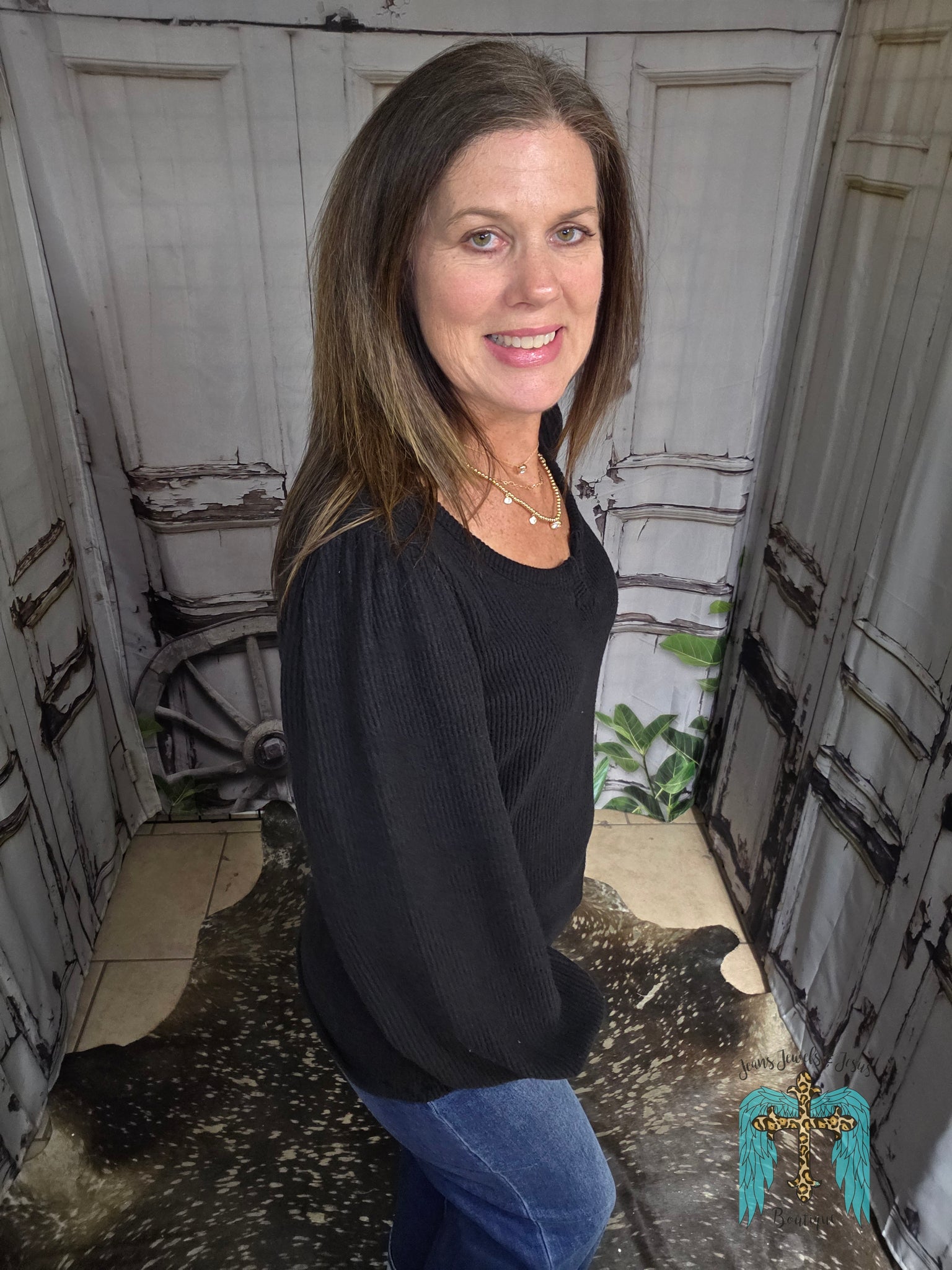 This black ribbed longsleeve top is super soft and comfy—perfect for layering or wearing on its own. Its classic solid color makes it an easy match with any outfit, adding a cozy yet stylish vibe to your wardrobe. Great for everyday wear with a playful twist!