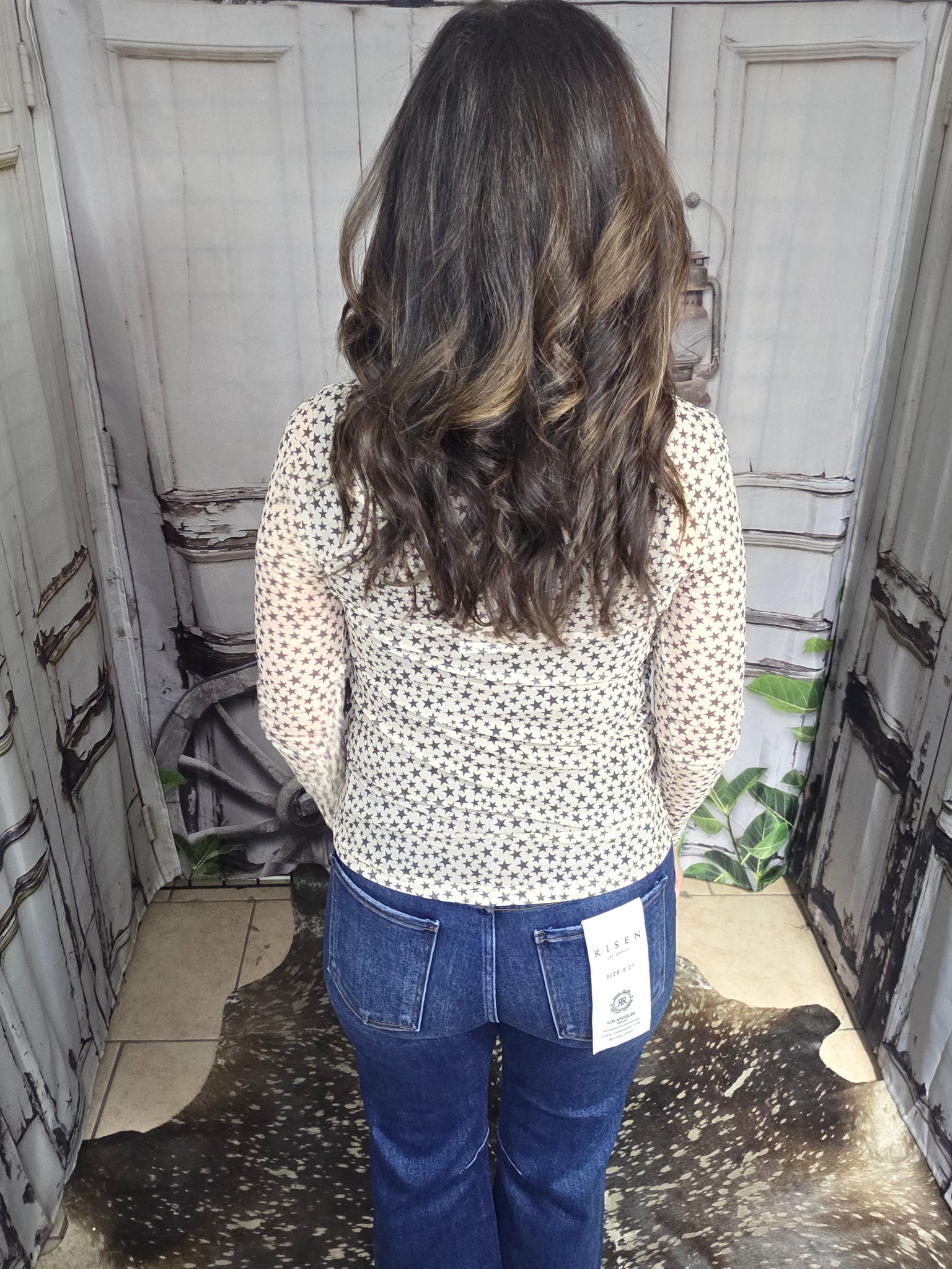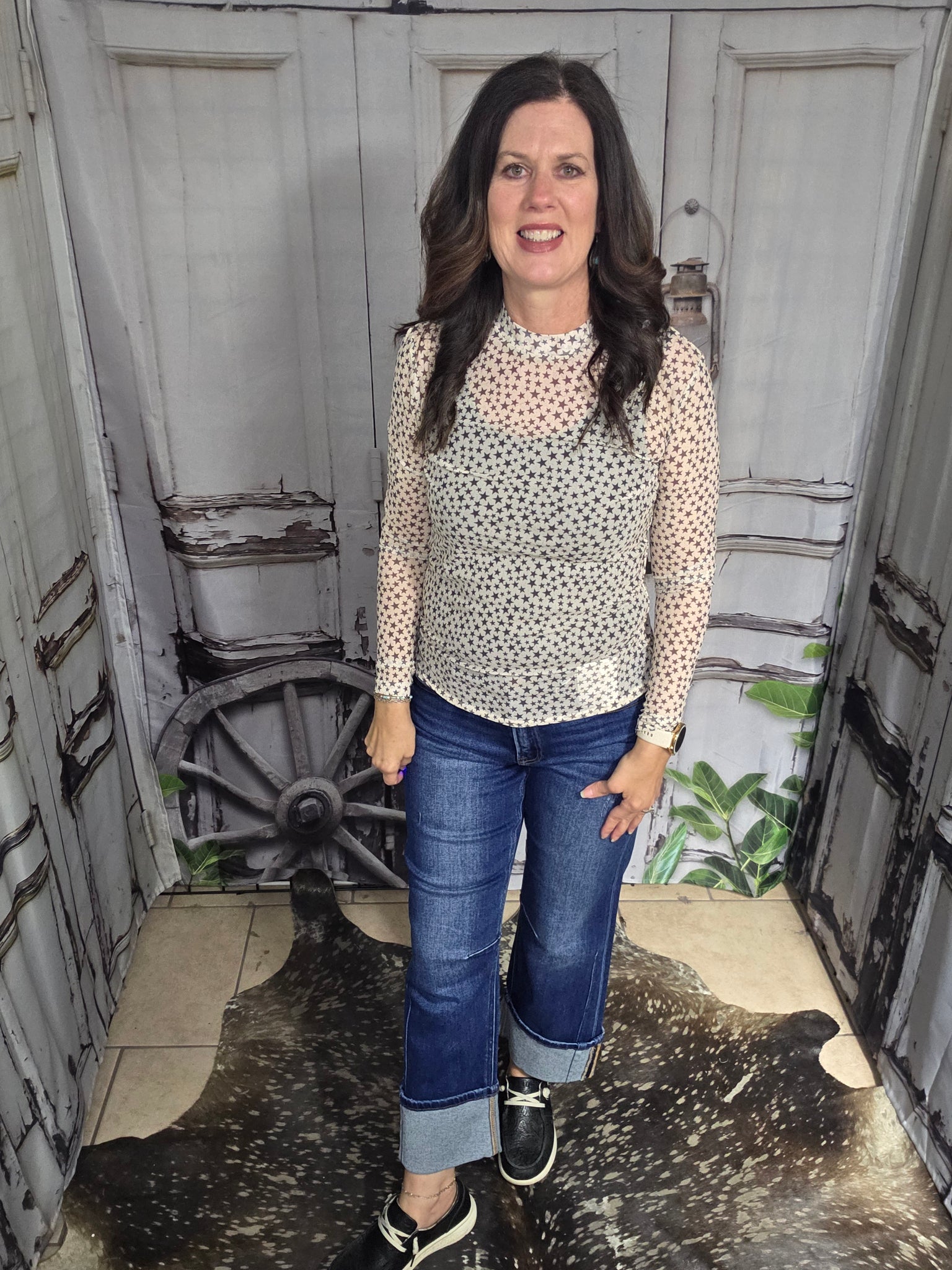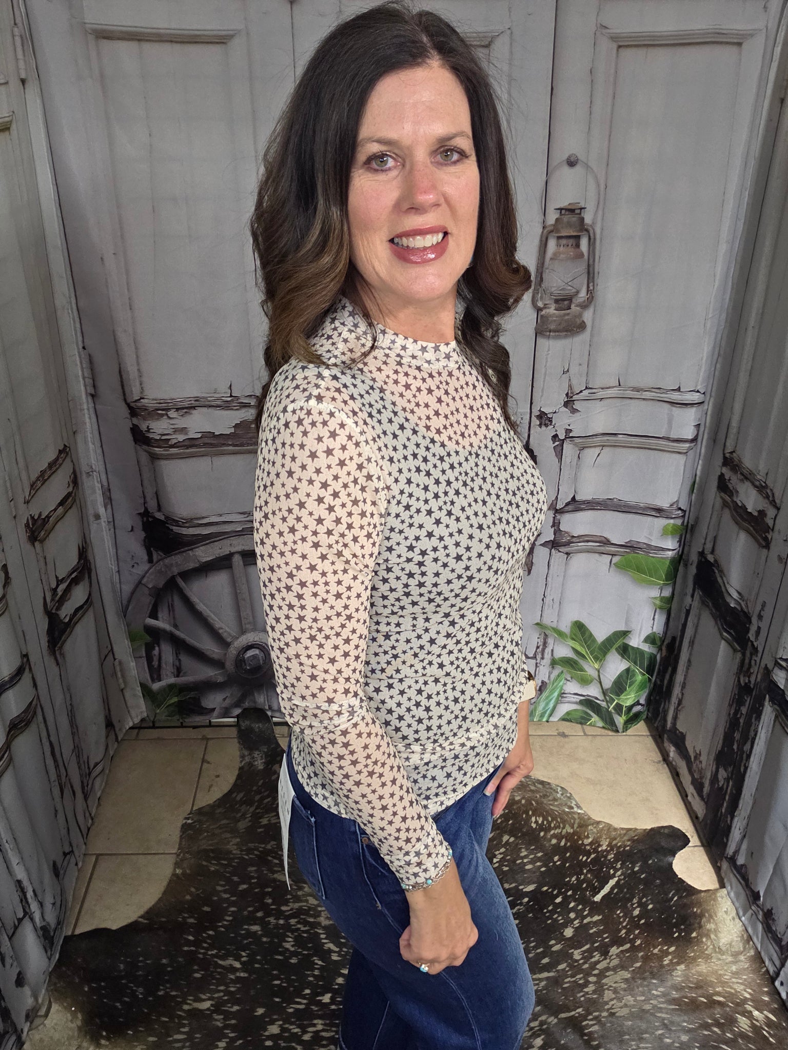 Layer this delicate mesh top over your favorite graphic tee for an effortless vibe, or let the tiny stars shine solo for a bold statement. Throw it on with a denim jacket when you want that perfectly cool, put-together look. Versatile, fun, and endlessly stylish—this piece does it all.